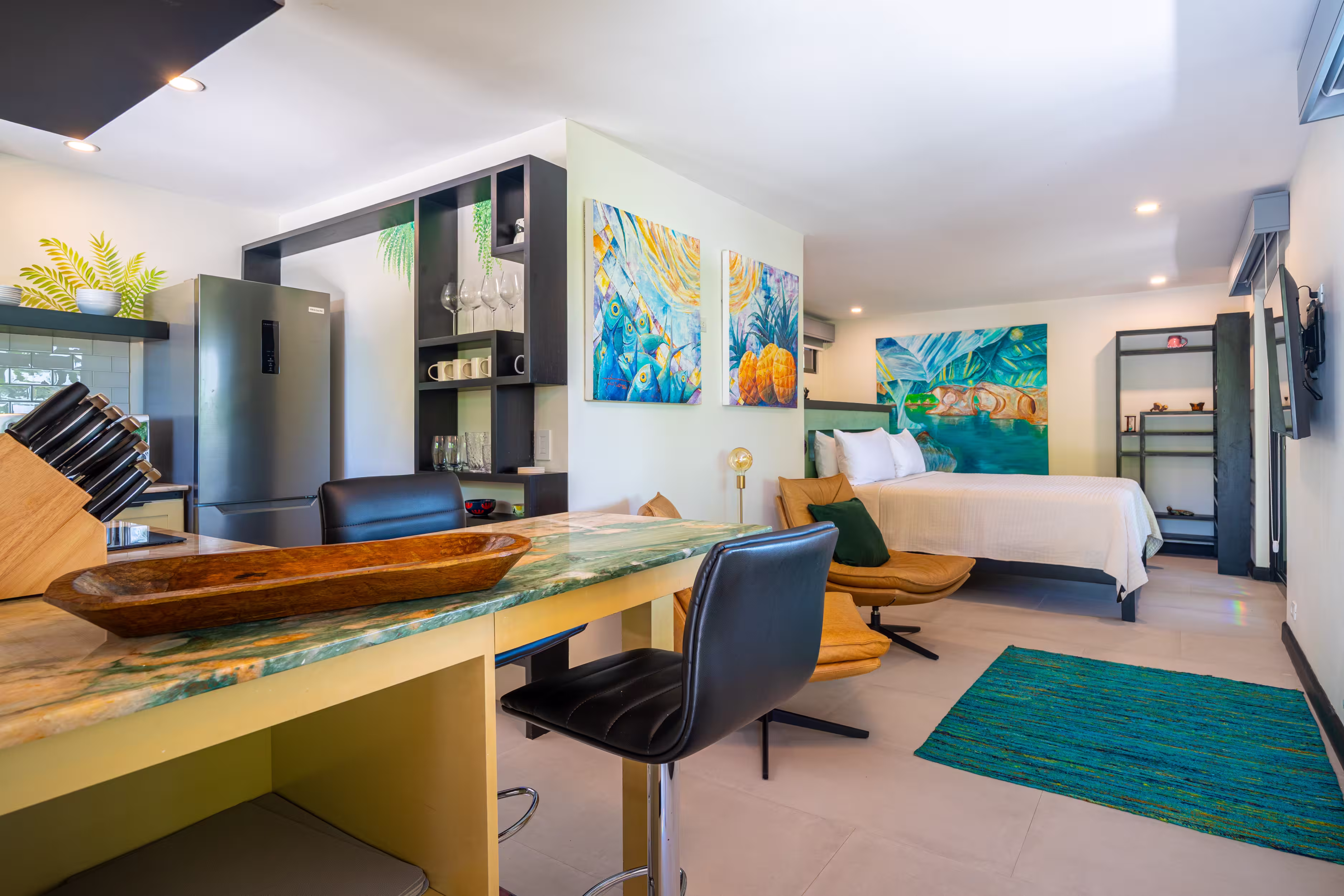 • Penthouse (130 m²) ~ Level 2 : open living/conversation area, ocean breezes; 1 King + 1 Queen; 2 bathrooms, terrace, sea views